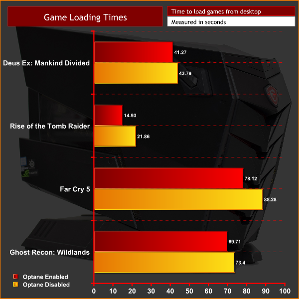 We then measured the loading times of the four games we benchmarked with the Aegis 3 – with Optane enabled, and then disabled.