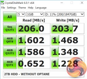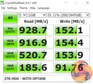 Using CrystalDiskMark 6.0.1, we can see Optane makes a big difference when it comes to synthetic drive speeds – the sequential read speed goes up from 206MB/s to 928.7MB/S, for instance.