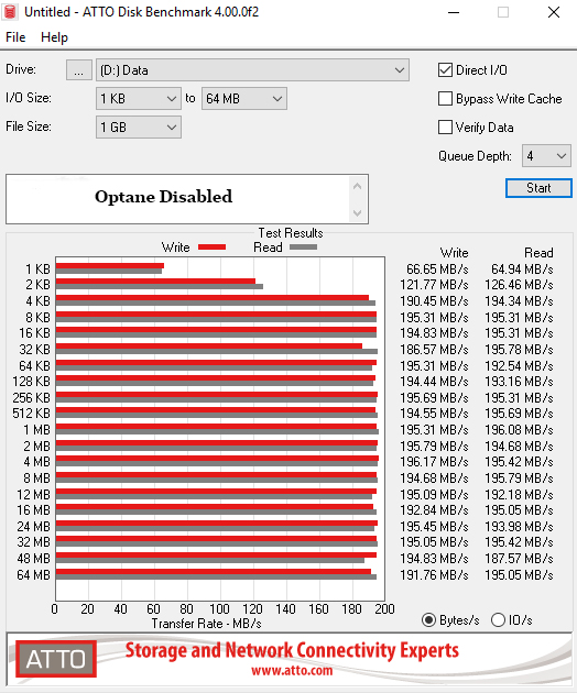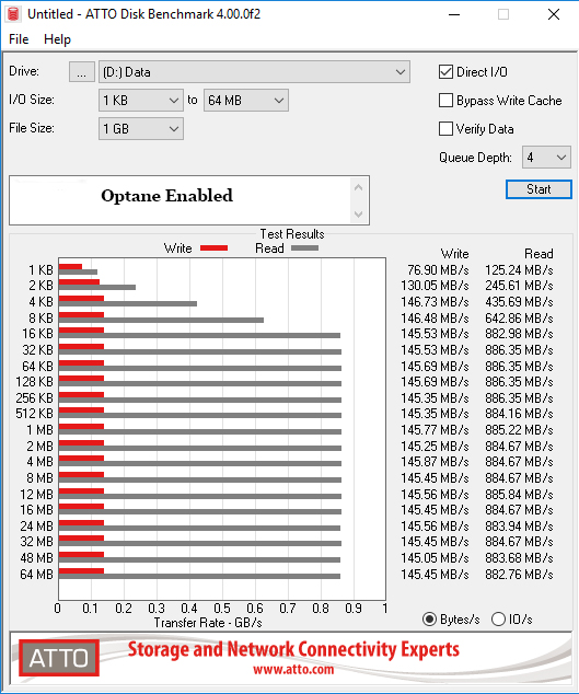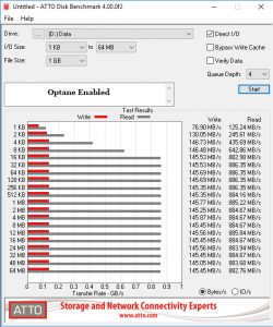 We see the same story when running ATTO Disk Benchmark. Read speeds are significantly higher across the board, although write speeds seem to get worse with Optane enabled – around 50MB/s slower when you compare the two sets of results.