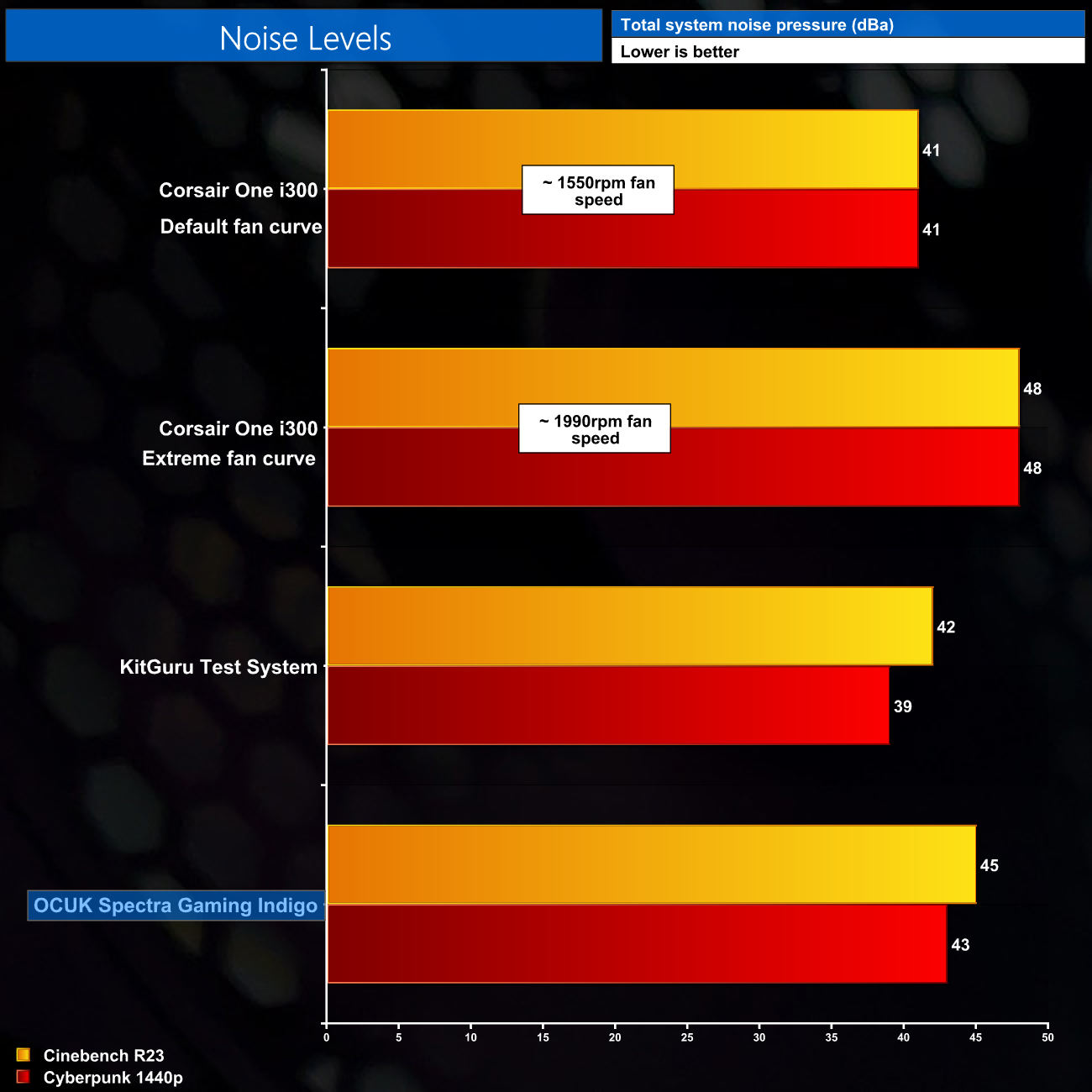 These thermal results do come at a slight cost of higher noise levels however, with the system hitting 43dBa when gaming, measured from 30cm away. It’s hardly loud, and would easily be drowned out by decent speakers or a headset, but we have tested quieter machines in the past.