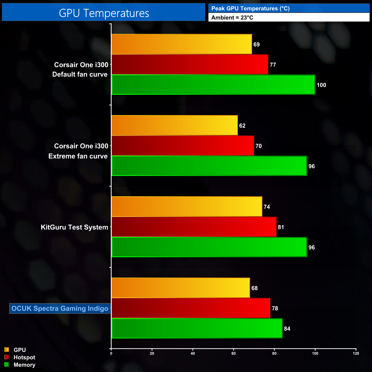 The GPU also does very well, hitting a hotspot of 78C during a 30-minute stress test in Cyberpunk 2077. The 84C reading for the GDDR6X is also impressive and is significantly lower than what our own Test System, and the Corsair One i300, were able to achieve.