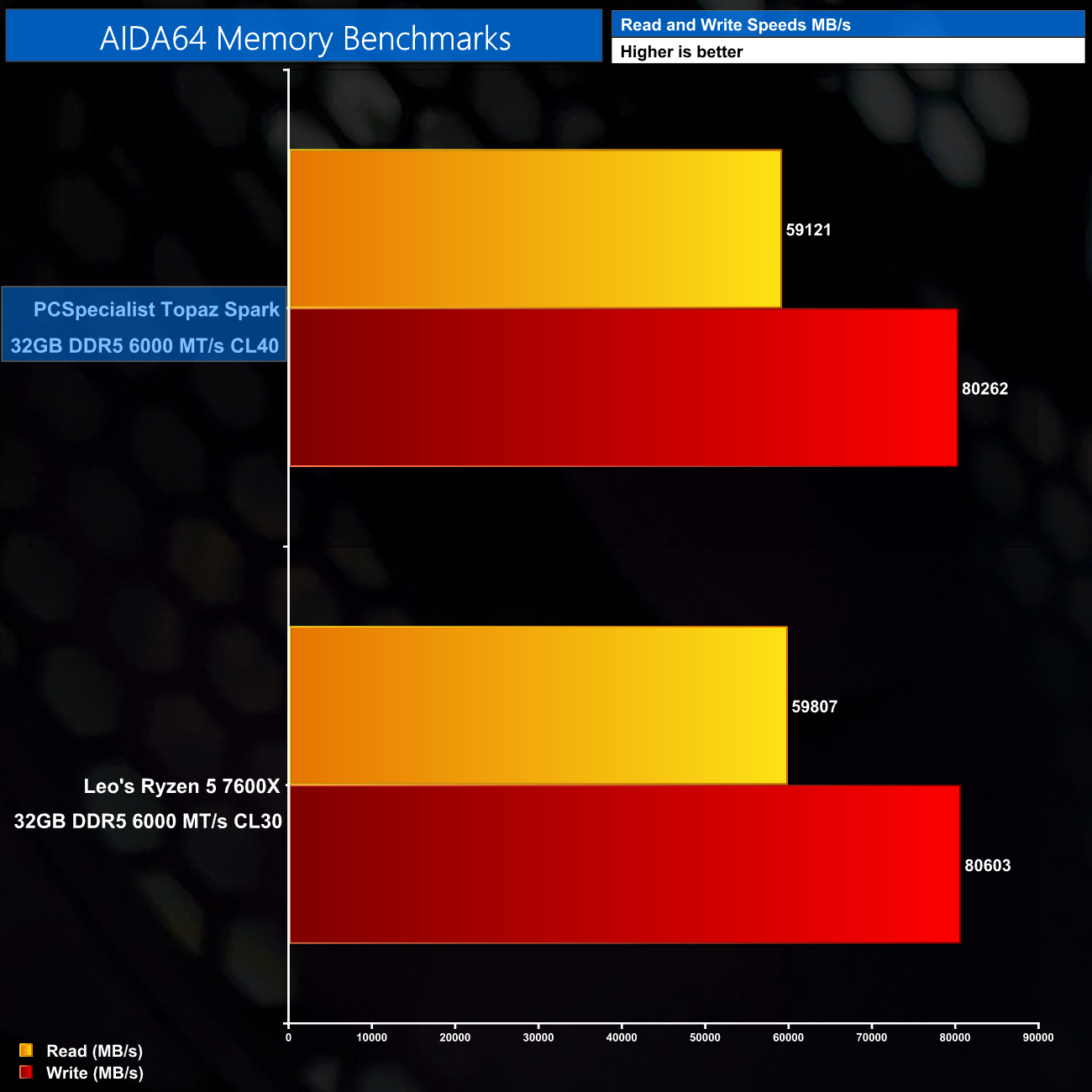 As for memory bandwidth, the Corsair kit may not have particularly tight timings but its read and write scores are almost identical to the G.Skill kit Leo used with his Ryzen 5 7600X testing so we can have no complaints.