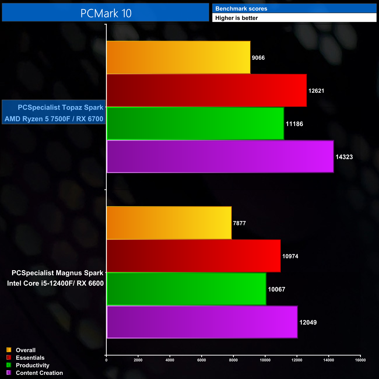 PCMark 10 is next and for this one I've compared the Topaz Spark to the Magnus Spark – another PCSpecialist unit I reviewed last year that was also priced at £999. It's good to see clear improvements across the board here, with a 15% increase to the Overall score, despite both systems being launched at the same price point.