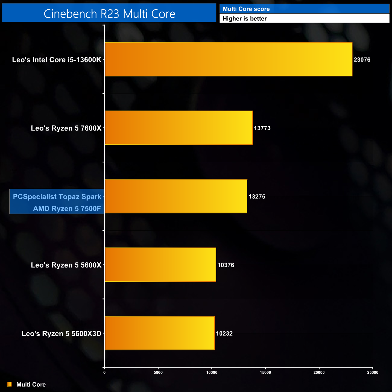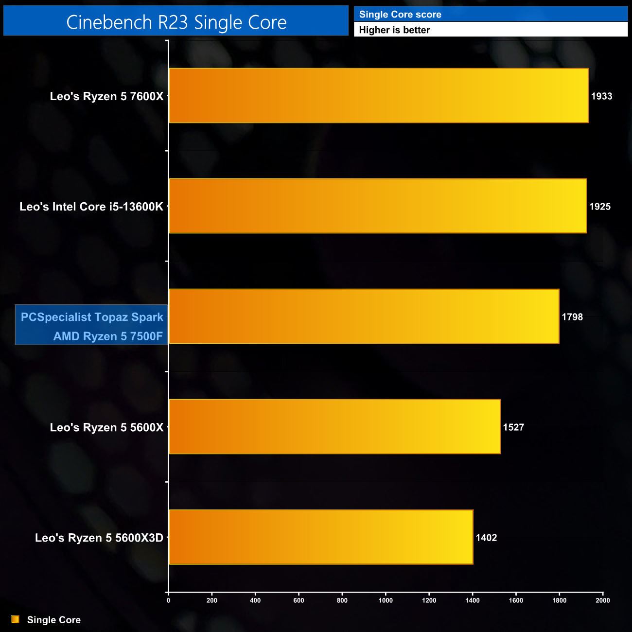 Starting our benchmarks with Cinebench Multi Core, despite a clock speed deficit, the Ryzen 5 7500F is performing very similarly to the Ryzen 5 7600X that Leo tested as part of our Ryzen 5 5600X3D review. That's a very good thing for the Topaz Spark though, everything is functioning as it should and we're getting six Zen4 cores to crunch through the workload.