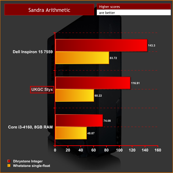 The first thing to note is the performance of the i5-6500 in the CPU arithmetic test. While significantly faster than my dual-core i3-4160, it lags behind the mobile i7-6700HQ in the Dell Inspiron 15 7559 due to its hyper-threading ability.