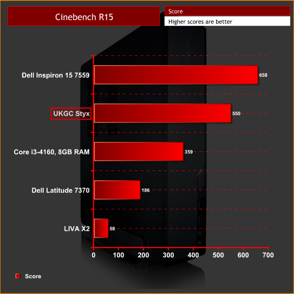Again, the i5-6500 falls behind the i7-6700HQ in Cinebench R15 as it lacks the extra virtual cores. However, for a locked, Core i5 processor the score of 550 is not bad at all.