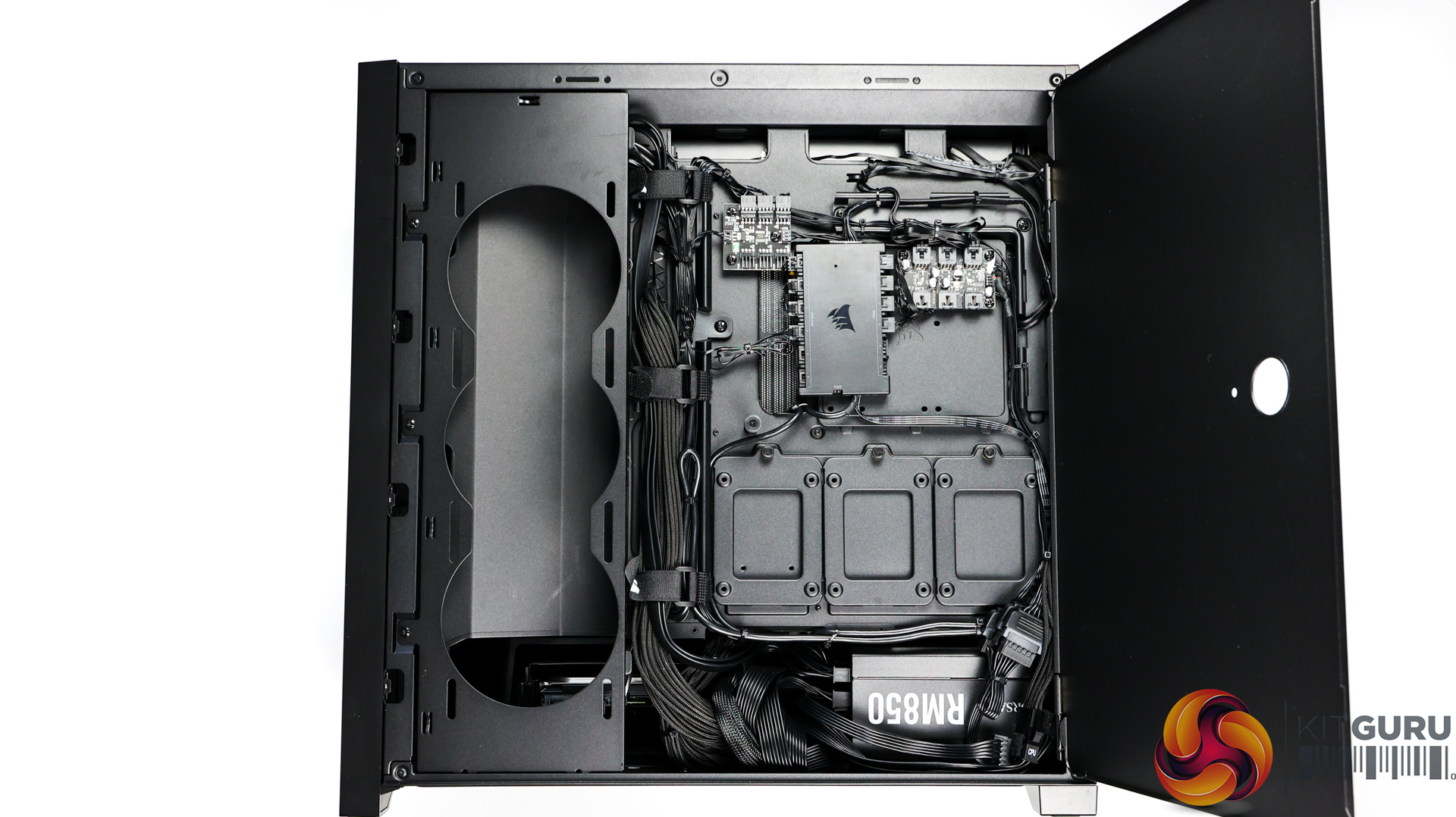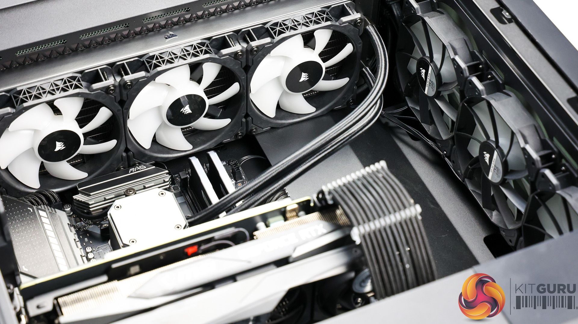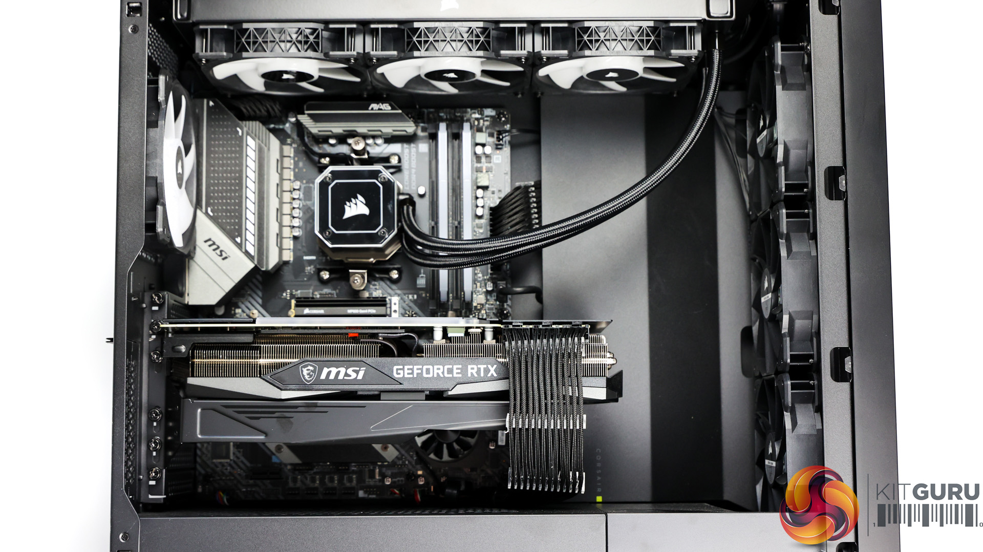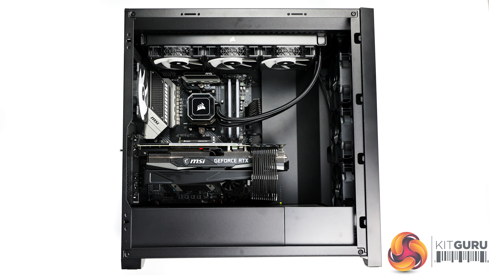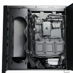 Inside, the system doesn’t look empty with any wasted space here. The MSI RTX 3080 Ti is a massive card, especially with the large bracket underneath it to try and help the inevitable and dreaded GPU sag. The bracket does pretty well though and the GPU only starts to sag at the end where it’s mostly unsupported. Paired with the Corsair H150i Elite 360mm AIO orientated at the top of the case, it definitely helps fill the space with the tubes coming down front the righthand side.