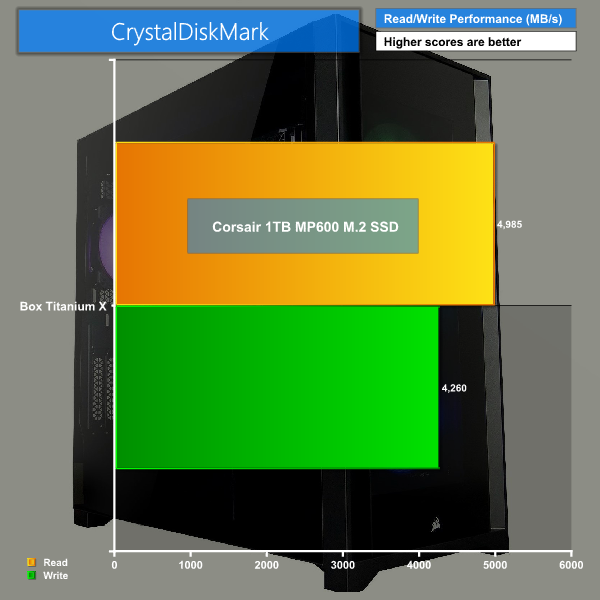 Moving over to CrystalDiskMark to test our Corsair MP600 PCIe Gen 4 NVMe SSD, we reach just shy of 5000Mbps read speeds with close to 4300Mbps write speeds, that’s definitely quick and actually just outperforms Corsair’s own claims of what speeds the drive can reach so that’s great to see. It's just a shame there isn't a 2nd gen' PCIe 4.0 drive used here instead though, like Corsair's own MP600 Pro, especially for the price of this system.