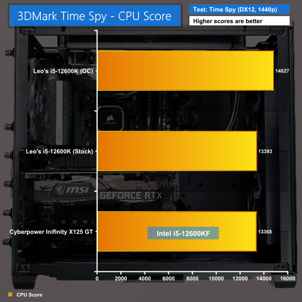 Looking at 3DMark Time Spy CPU scores, our Intel i5-12600KF placed last but only just barely and it's clearly within the margin of error, there’s not a lot to it here and of course we expect the overclocked version to outperform it. Another good result. This shows the Intel i5-12600KF is performing as it should.