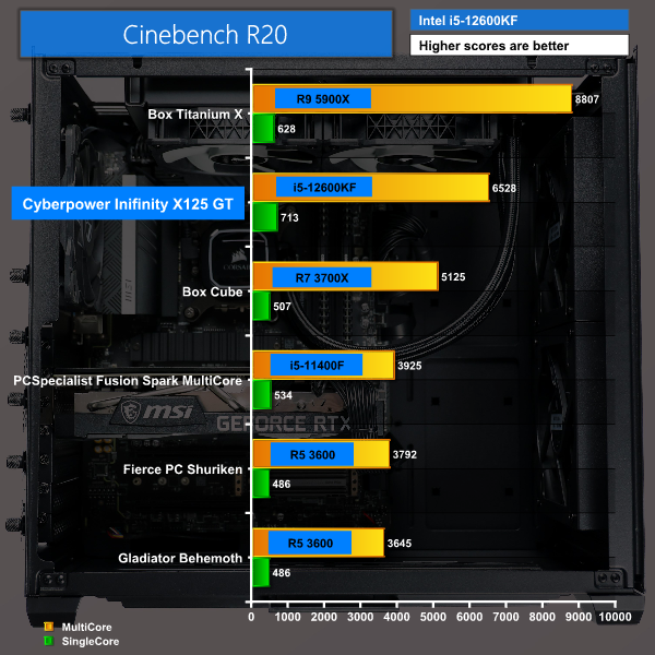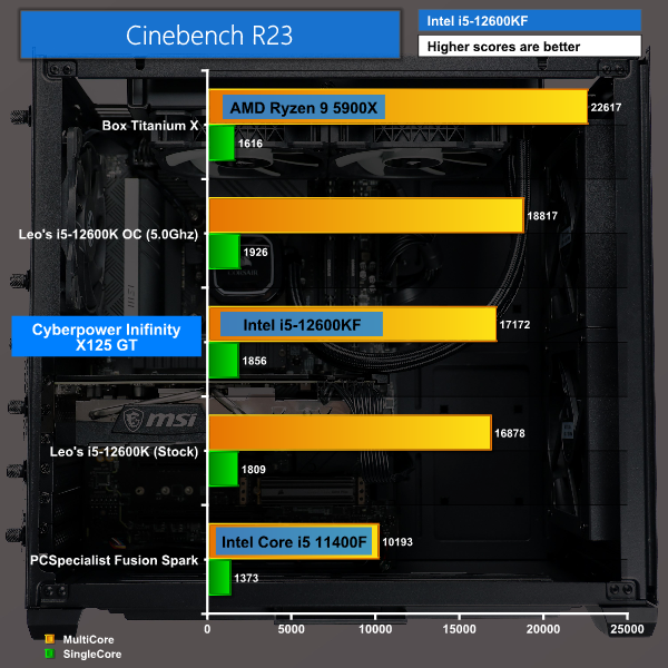 Our Cinebench R23 results saw our Intel i5-12600KF score right in between Leo’s overclocked and stock Intel i5-12600K results in both the multicore and single-core tests, it’s pretty much exactly the same results as the stock version but that’s good that the Cyberpower is performing the same.
