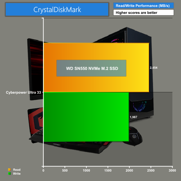 CrystalDiskMark saw our WD SN550 drive outperform the read speed claims of 2400Mbps with an extra 54mbps, which is a great result and despite the fact there are many much faster drives out there we need to remember this whole bundle is less than £900 and for that I think this is great. Write speeds also just outperformed the claimed speeds too, which is awesome.