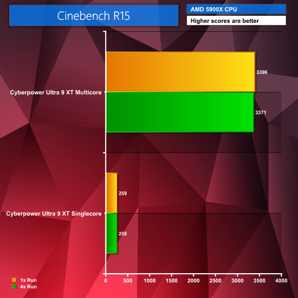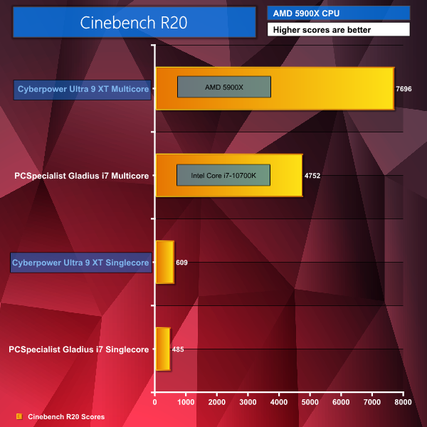 Cinebench R20 results are compared with the PCSpecialist system and as you can see the Cyberpower’s 5900X really wiped the floor with the i7-10700K’s multicore results, though we would expect this given its increase core count. Even the single-core performance pulls into a steady lead though.