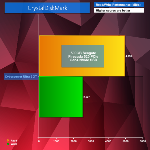 CrystalDiskMark results are what we were expected, but they are also slightly disappointing… and here's what we mean. The 500GB Seagate Firecuda 520 drive is rated for 2500MB/s writes but the 1TB and 2TB models are rated for 4400MB/s writes. Our drive is rated at a 5,000MB/s read, which we pretty much achieve here and while we scored 2,527MB/s write, which is just above the official rated speed, we still feel it’s a bit on the slow side for 2021 standards. There are drives available now, using Phison's latest E18 controller, that can deliver in excess of 6000 MB/s writes, so we’d have loved to see something faster here.