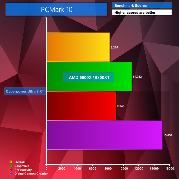Time taken to render our BMW CPU test within Blender 2.93 was 120 seconds, which is very quick and what we’d want to see from our 12-core 5900X. PC Mark 10 shows how well the system performs at a variety of tasks, with a particularly excellent result in the digital content creation benchmark.