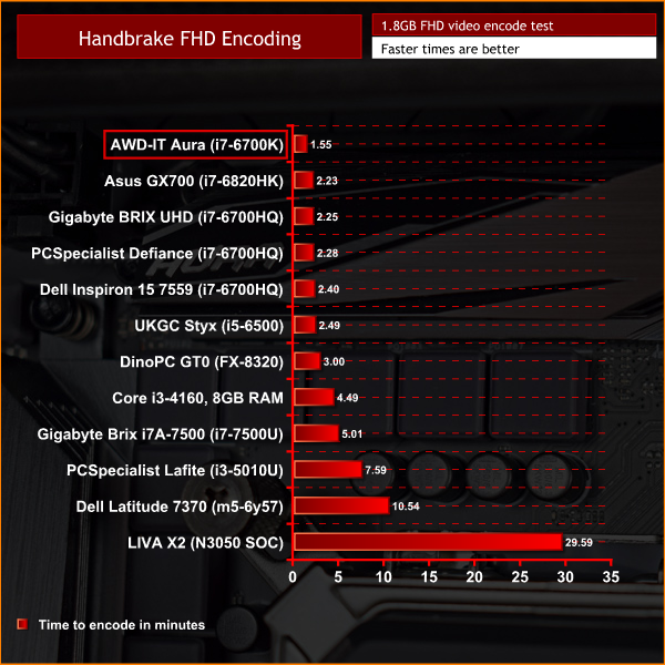 The last of our CPU-specific tests, Handbrake exhibits the same trend we have seen previously. The i7-6700K shoots to the top of the chart thanks to its 4 cores, 8 threads and high clock speed.