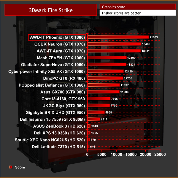 Again, in Fire Strike, the GTX 1080 pushes the Phoenix to the top of the chart. That being said, a graphics score of ~21000 is a little on the low side for Fire Strike, and I would say that this is likely due to the lack of factory overclock on the Inno3D card. I have definitely seen some faster GTX 1080s which can deliver 22000 or even 23000 in Fire Strike.