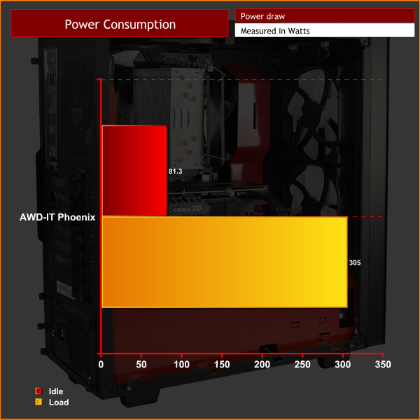 For ‘idle’ power draw, a reading was taken after having Windows open on the desktop for 30 minutes. A reading under load was taken with Prime 95’s SmallFFt test running alongside 3DMark Fire Strike.