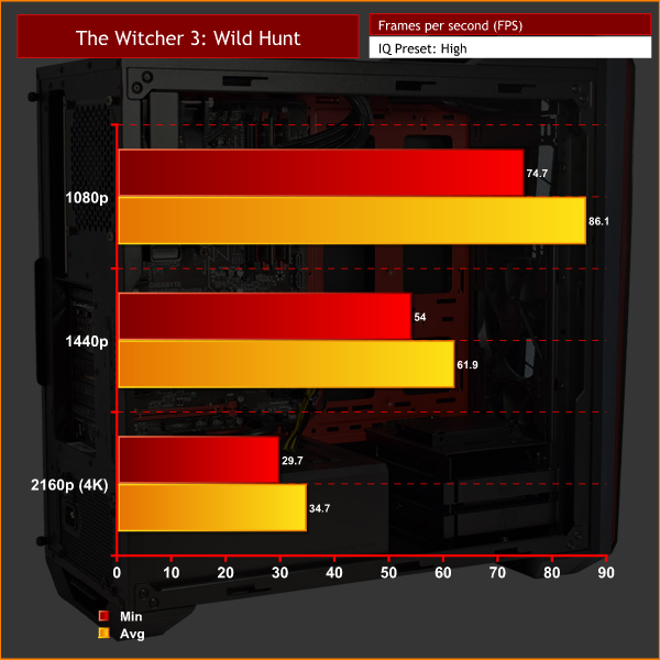 We test using the ‘high’ preset. Given The Witcher 3 does not have its own in-built benchmark, I tested near the beginning of the game with Geralt riding through White Orchard on his horse, before dismounting and carrying on on-foot. I benchmarked 3 closely-matched runs and then took the average figures from those runs to present here.