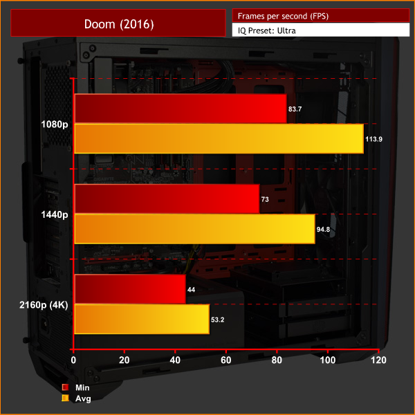 DOOM offers the best frame rates of any game on-test today. The 1080p and 1440p results are fantastic, while a minimum of 44 FPS at 4K is also very playable.