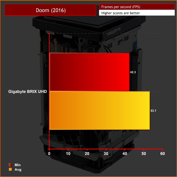 We test using the ‘ultra’ preset. Given Doom does not have its own in-built benchmark, I tested at the beginning of the game as the player destroys the very first Gore Nest. I benchmarked 3 closely-matched runs and then took the average figures from those runs to present here.