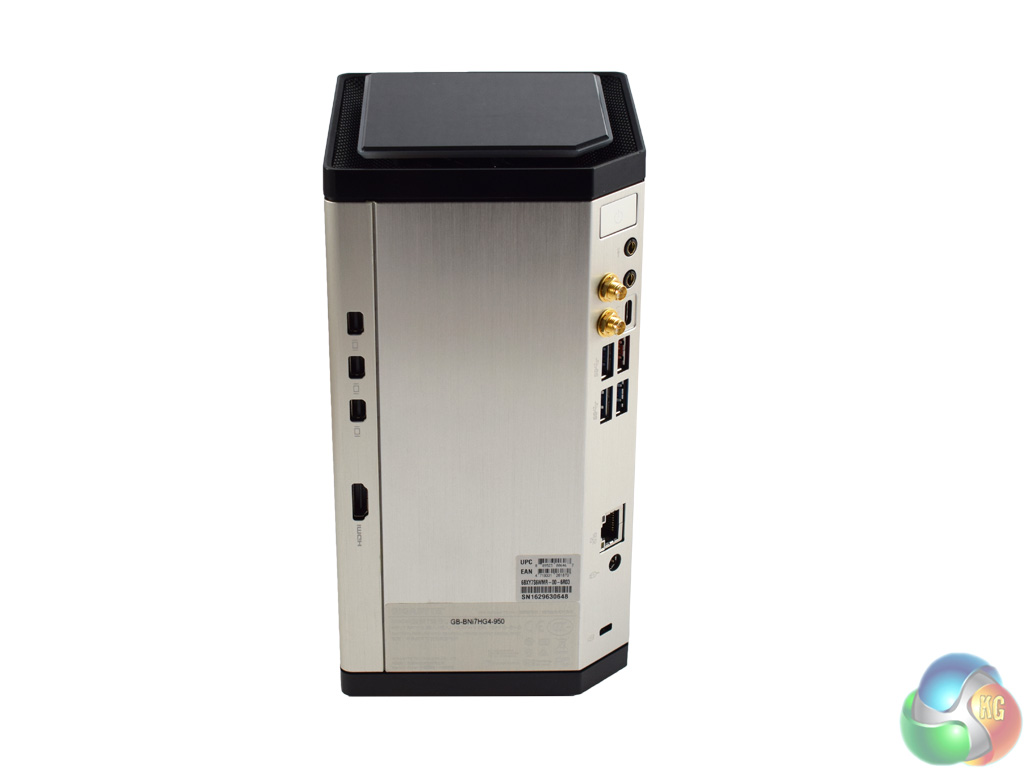 In the rear corner are the other I/O ports. A good array for such a small device, we find 2x USB 3.1 (one Type-C, one Type-A) as well as 3x USB 3.0. There are also the usual headphone jacks and antenna mounts for the integrated WiFi chip.