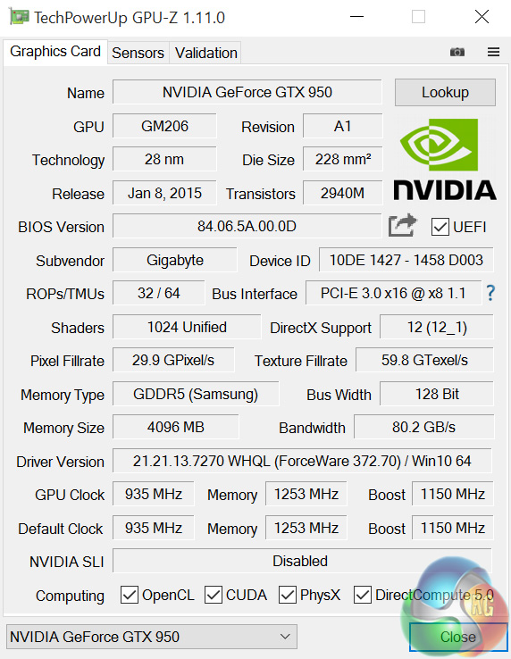 The GPU is a 4GB version of the Nvidia GTX 950 – released towards the middle of last year. It is part of the Maxwell family, and we are yet to see a direct successor from the newer Pascal architecture. It has 4GB of GDDR5 memory, with an effective bandwidth of 80.2GB/s over the 128-Bit bus.