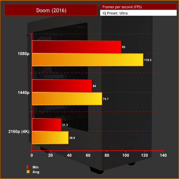 Doom is a well-optimised title and both looks and runs beautifully across all 3 resolutions. At 4K the frame rate does dip down to a minimum of 31.3, but many would still consider this very playable. With just a couple of tweaks to the IQ settings, too, the frame rate would be even smoother.