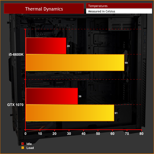Despite the overclock using 1.35 volts, a maximum temperature of 68 degrees for the i5-6600K is an excellent result, and a testament to the 120mm AIO watercooler used by OCUK. A peak temperature of 61 degrees for the GPU is similarly impressive.