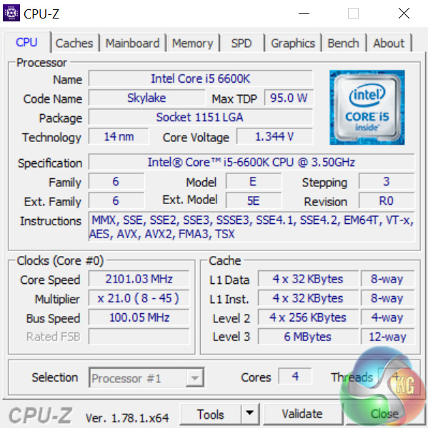 The i5-6600K is a quad-core chip but it does not support HyperThreading. OCUK overclocked it to 4.5GHz using 1.35 volts.