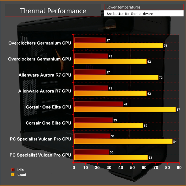 The Overclockers Germanium stays impressively cool despite its powerful, overclocked hardware. The CPU certainly gets a little toastier than some but it’s still well short of a level that would concern us. Meanwhile the GPU hits a very comfortable 62°C, so there’s plenty of headroom there.