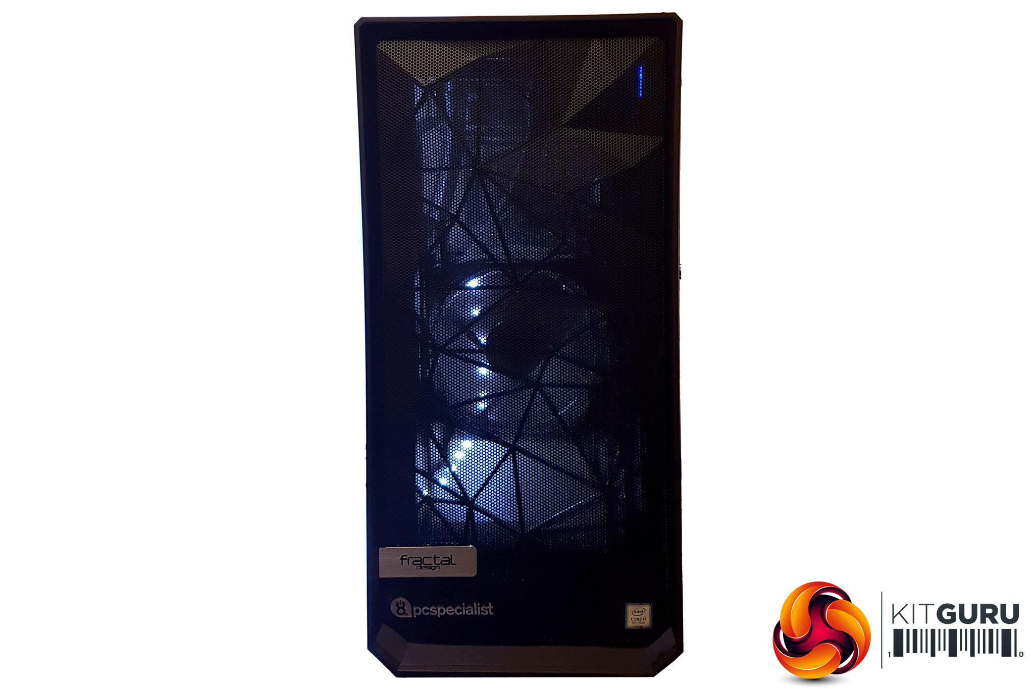 PC Specialist has opted for the Fractal Design Meshify C and its signature is an angular mesh on the front that allows for three big fans to pull in air. It’s functional but isn’t the most attractive, particularly once a PC has bright lights in it, as it does here. The lighting shines through the grill on the front, making a show of the lattice support structure, fans and brackets behind.