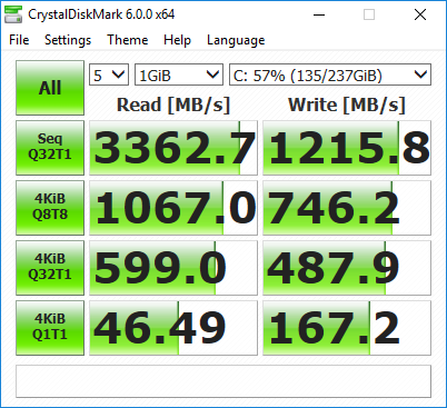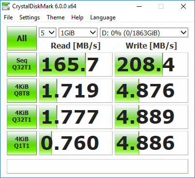 CrystalDiskMark 5.1.1 is an industry standard benchmark for testing the raw speed of a storage device. It uses a test file to variously write data to or read data from the drive, checking for sequential read and write speed and random read and write performance, with it also testing performance at various queue depths. The size of the test file can be selected from 50MB to 32GB. We test using the default 1GB file size.