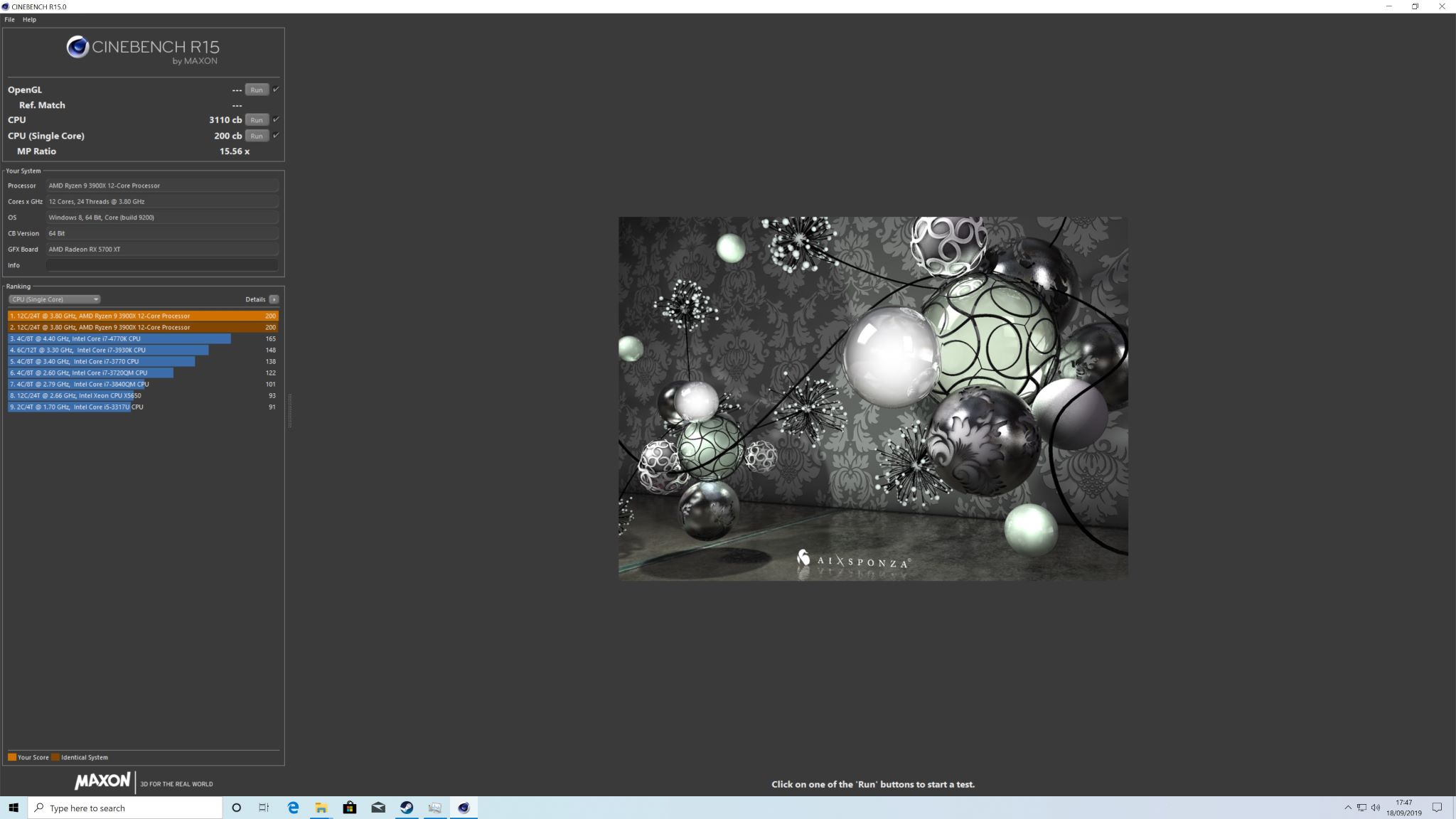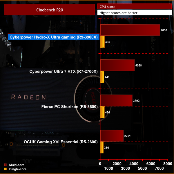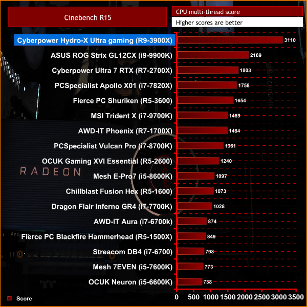 Since the Cyberpower Hydro-X system is equipped with the latest Ryzen 3900X, an ideal CPU for productivity tasks, we will run a series of tests on both Cinebench R15 and R20 and compile a chart below to compare the results.