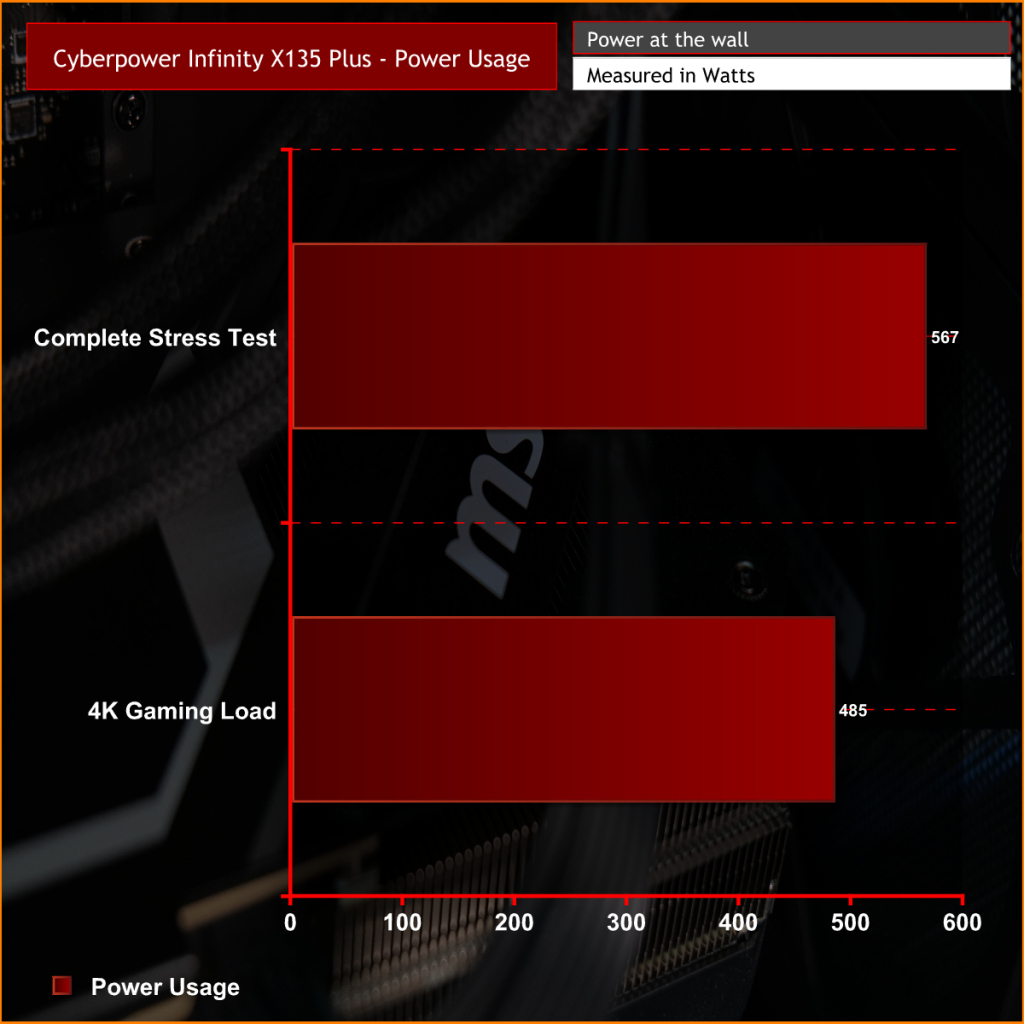 An important characteristic of any gaming PC is how it handles the cooling of the internal components. To see how the Cyberpower Infinity X135 Plus stacks up we ran a high load on the system with the case in its default configuration to simulate long gaming sessions and measured the steady state temperature of the CPU and GPU.