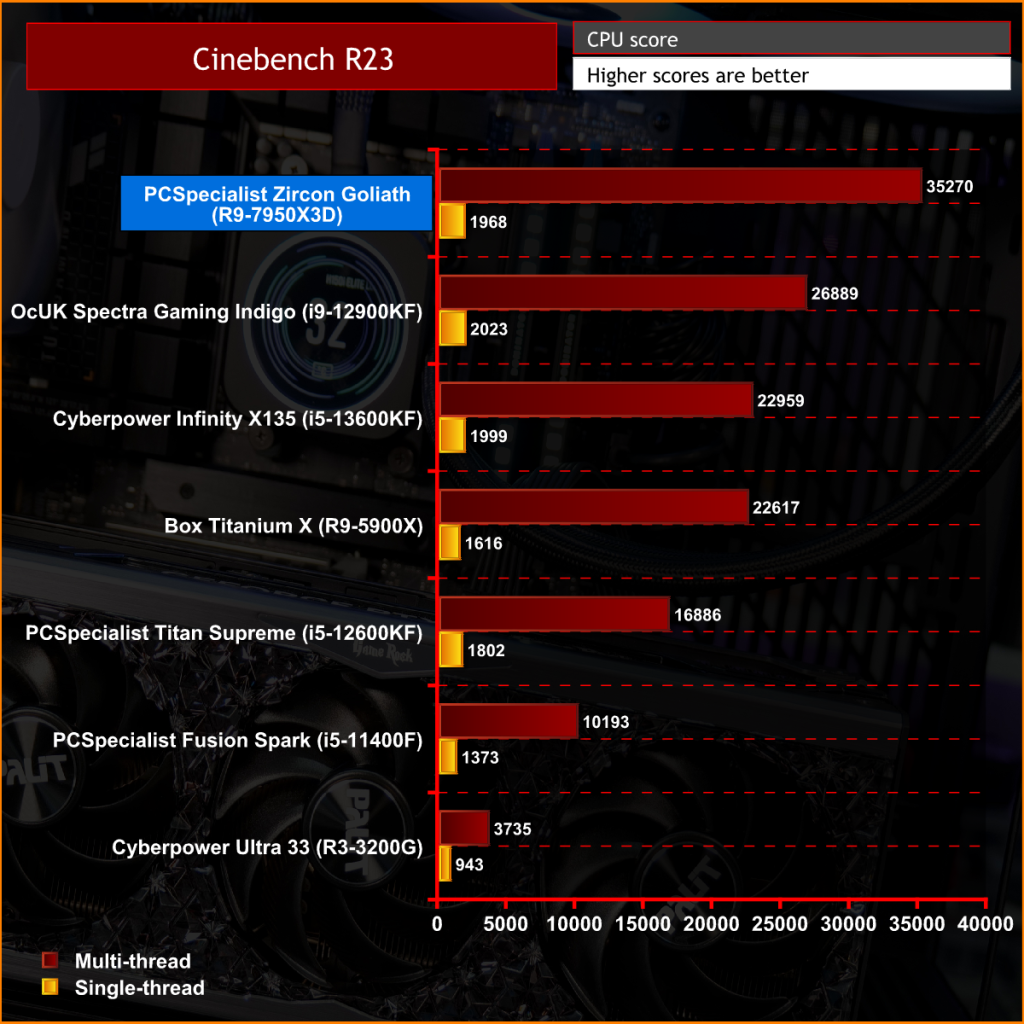 No problems with the Cinebench R23 CPU multi and single-thread scores in the PCSpecialist Zircon Goliath. The AMD Ryzen 9 7950X3D is running these benchmarks with results very similar to what Leo found in his launch review of the 7950X3D so all seems to be good here.
