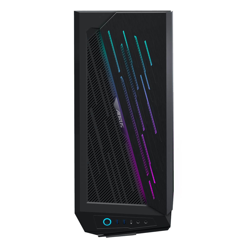 The Aorus Model X chassis offers good thermal performance and stylish aesthetics thanks to a half-vented, half-tempered glass front panel with RGB lighting and a half-vented top panel with RGB. Rated with acoustic performance below 40dB while gaming, the inside of the Model X was organised to allow less experienced users to mount an SSD or add another component to the system with ease. The chassis comes with an integrated GPU bracket and a 360mm AIO cooler. The side panel can either be transparent or metallic.