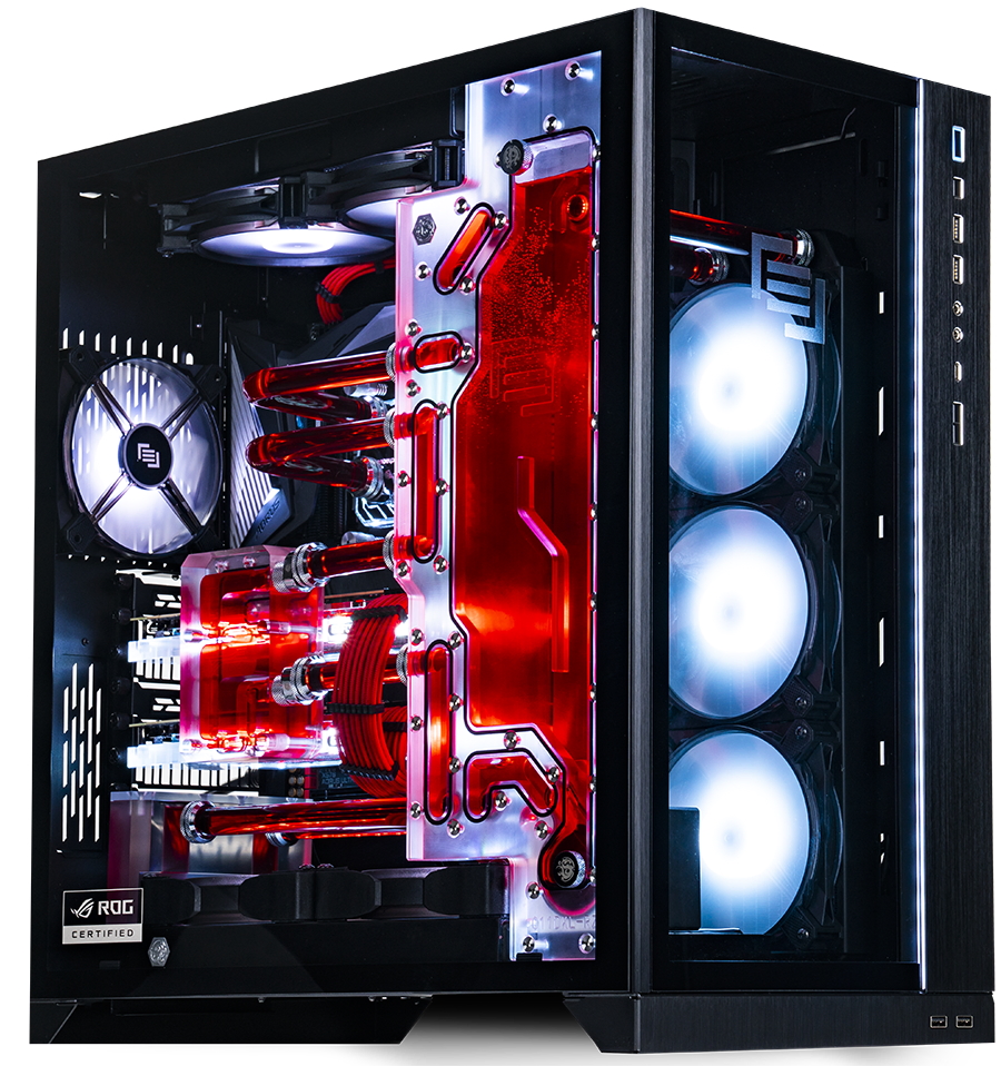 As a ROG certified series, the PCs use ASUS’s Aura Sync software to synchronise and customise the RGB lighting system and any compatible peripherals. Besides the internal lighting system, the exterior can also be customised by adding custom paint finishes and Marc designs. The included APEX liquid cooling system includes a custom pump, “pressure regulated cooling”, a flow rate sensor, and a big reservoir with multiple custom blocks, bridges and tubes.