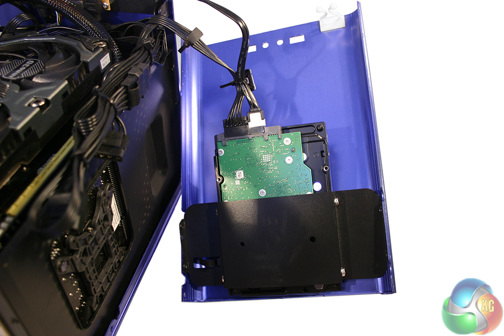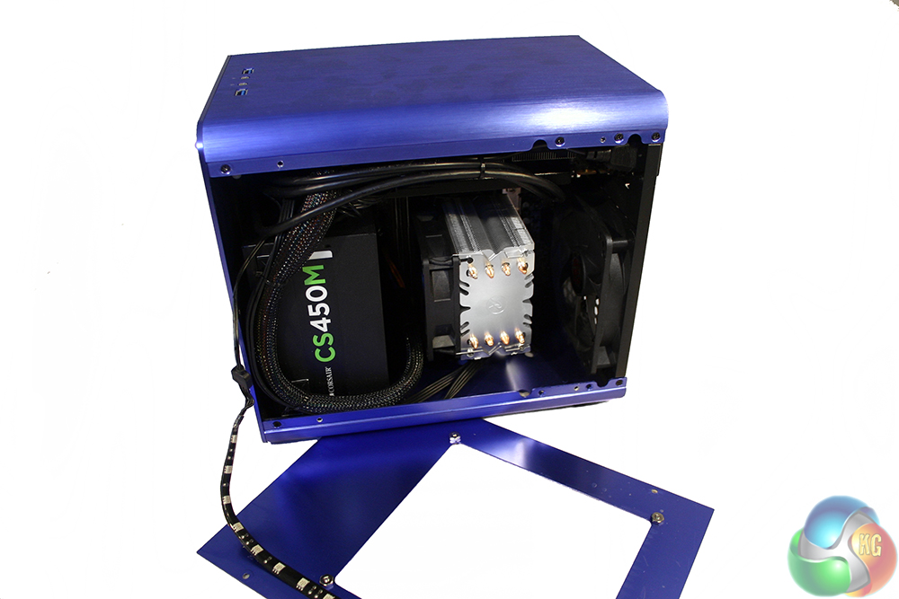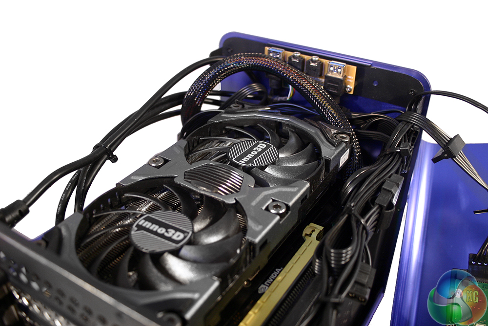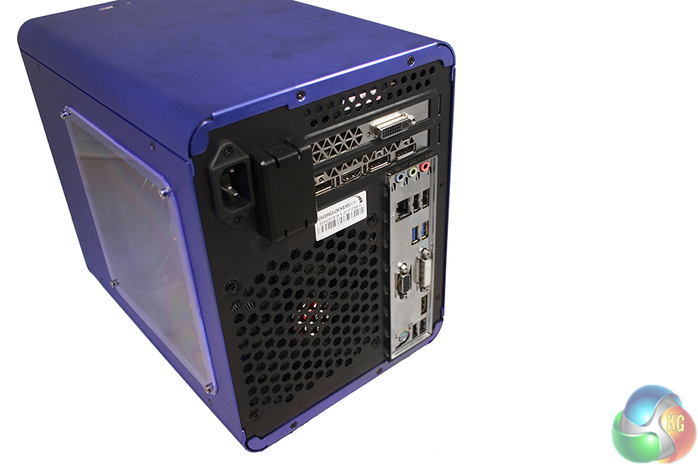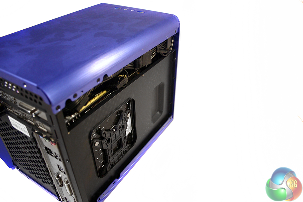 The back of the system is reversed from the typical gamer set ups we see, since the power supply is mounted at the front – the cable is routed through to the top. Rather different too, the graphics card can be found at the top of the system, because the motherboard is reversed from the usual configuration.