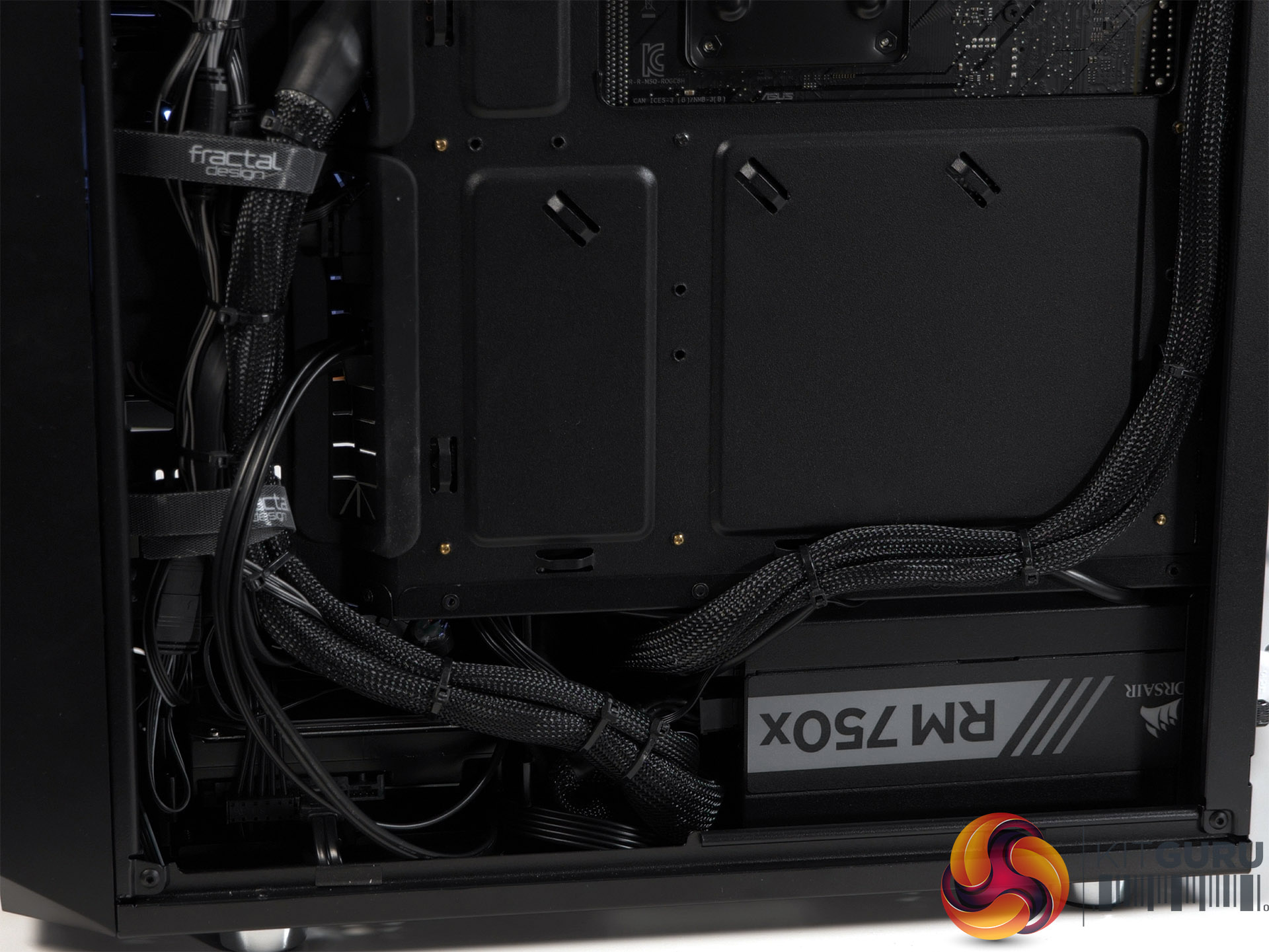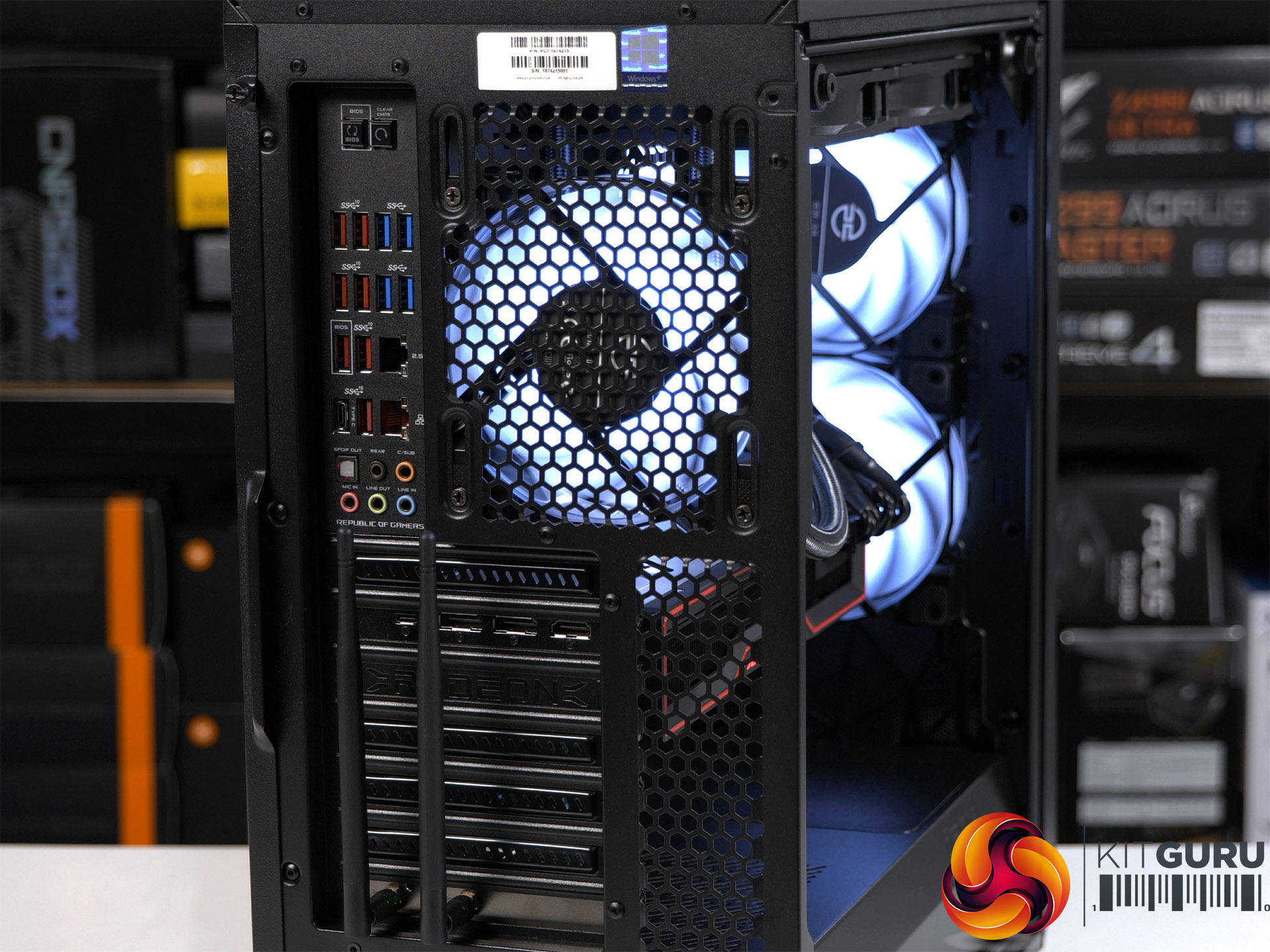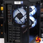 As you will have seen in our video, the Fractal Design Meshify C is a compact chassis with very little room to spare around the motherboard, however PC Specialist has found space for a 240mm AIO cooler, five 120mm fans and four modules of full height Corsair Vengeance RGB memory. There is a fair amount of cabling tucked around the back of the PC however the end result is neat and tidy, despite being so densely packed.