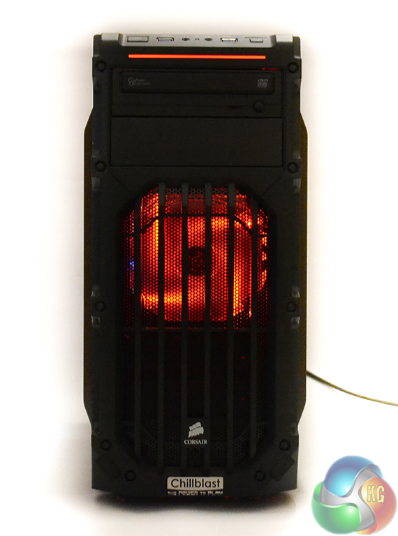 Around the front of the chassis, Chillblast applies its own “The Power to Play” company badge below the Corsair logo. The front filtered section can be used to house two fans, although Chillblast opts to use only the stock red LED 120mm fan.
