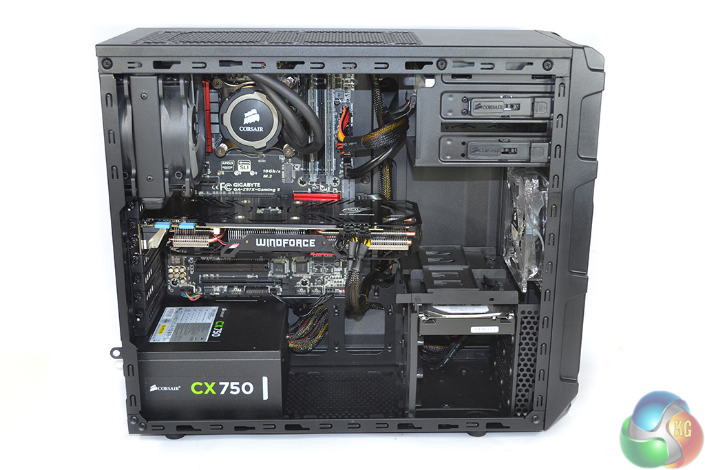 Removing the side panel gives a first look at the spacious interior of Corsair's SPEC-03 chassis. Clearance for Gigabyte's lengthy Windforce-cooled GTX 970 is not a concern, although adding an identical card for SLI will not be possible with the HDD cage.