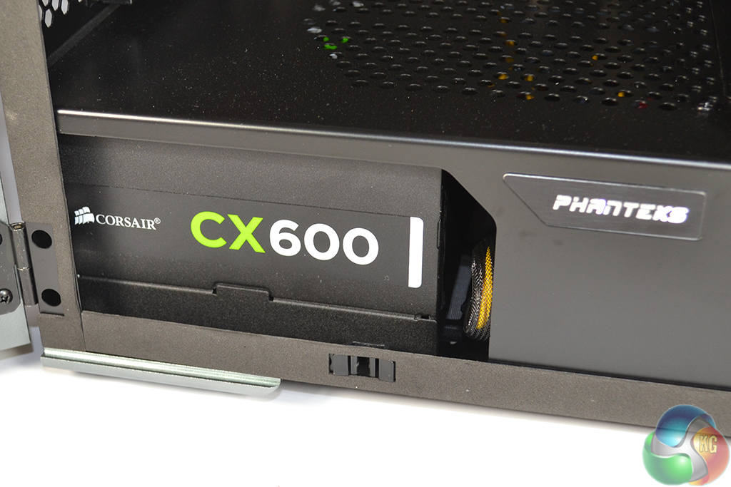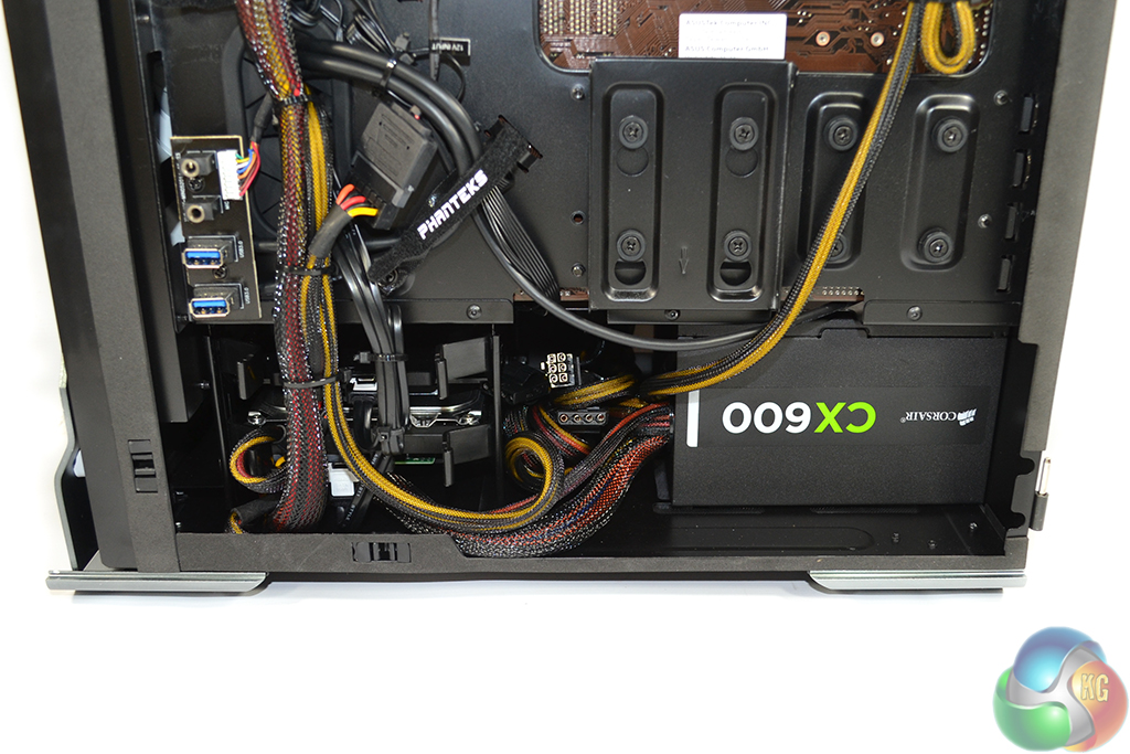 Corsair's 600W CX600 power supply is stealthily hidden in the case's bottom chamber. Not much more than the PSU itself is on show – a metal covering piece built onto the chassis hide the mess of power cables.