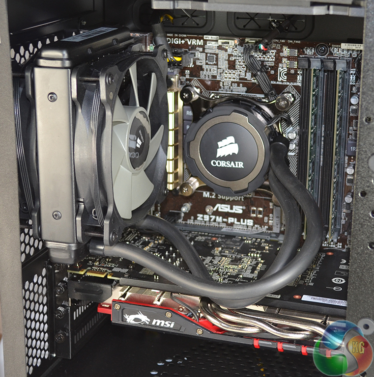 Both of the H75 cooler's 2000 rpm 120mm fans are positioned as exhaust. This allows them to draw air out of the system while passing it through the radiator.
