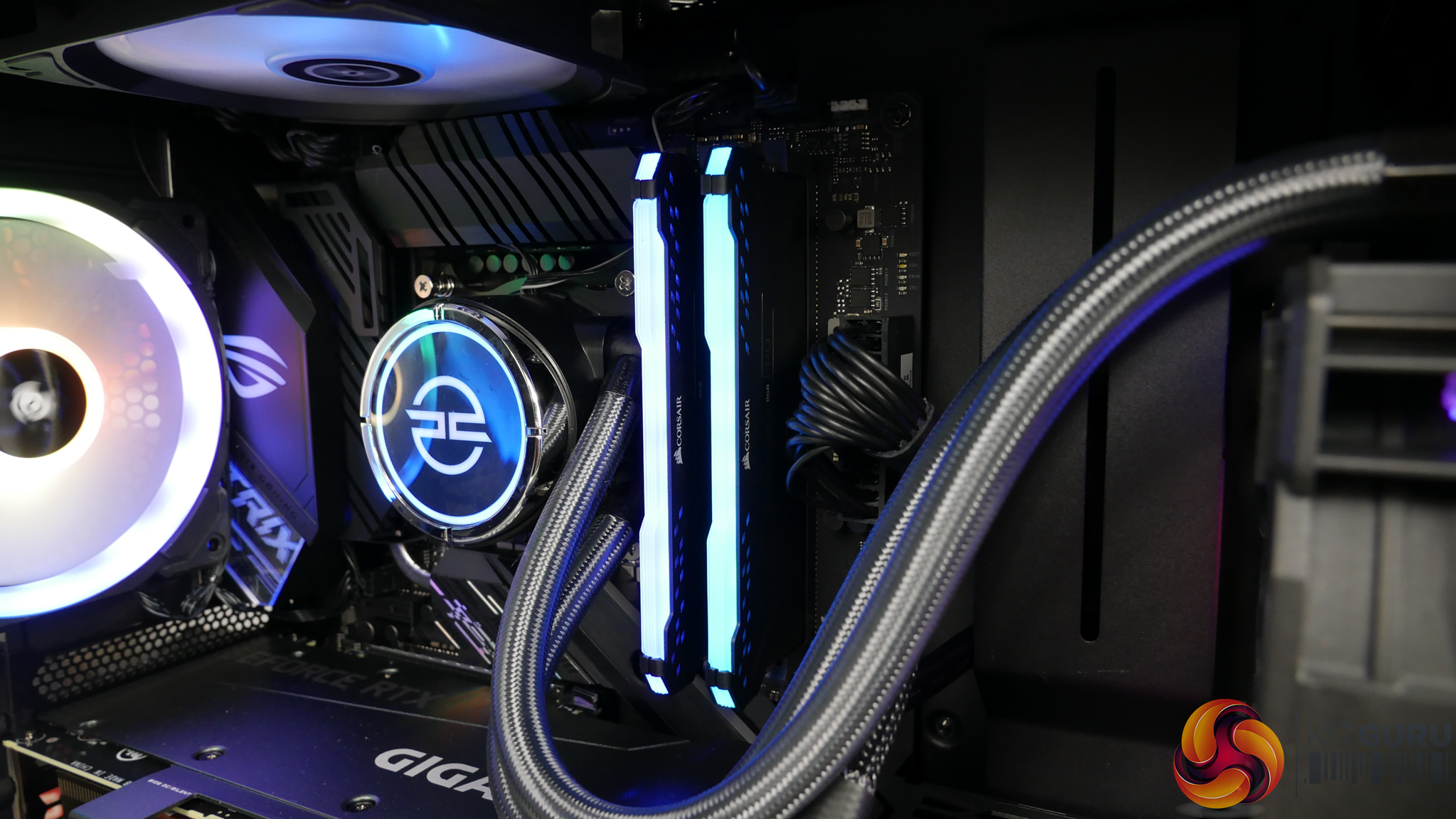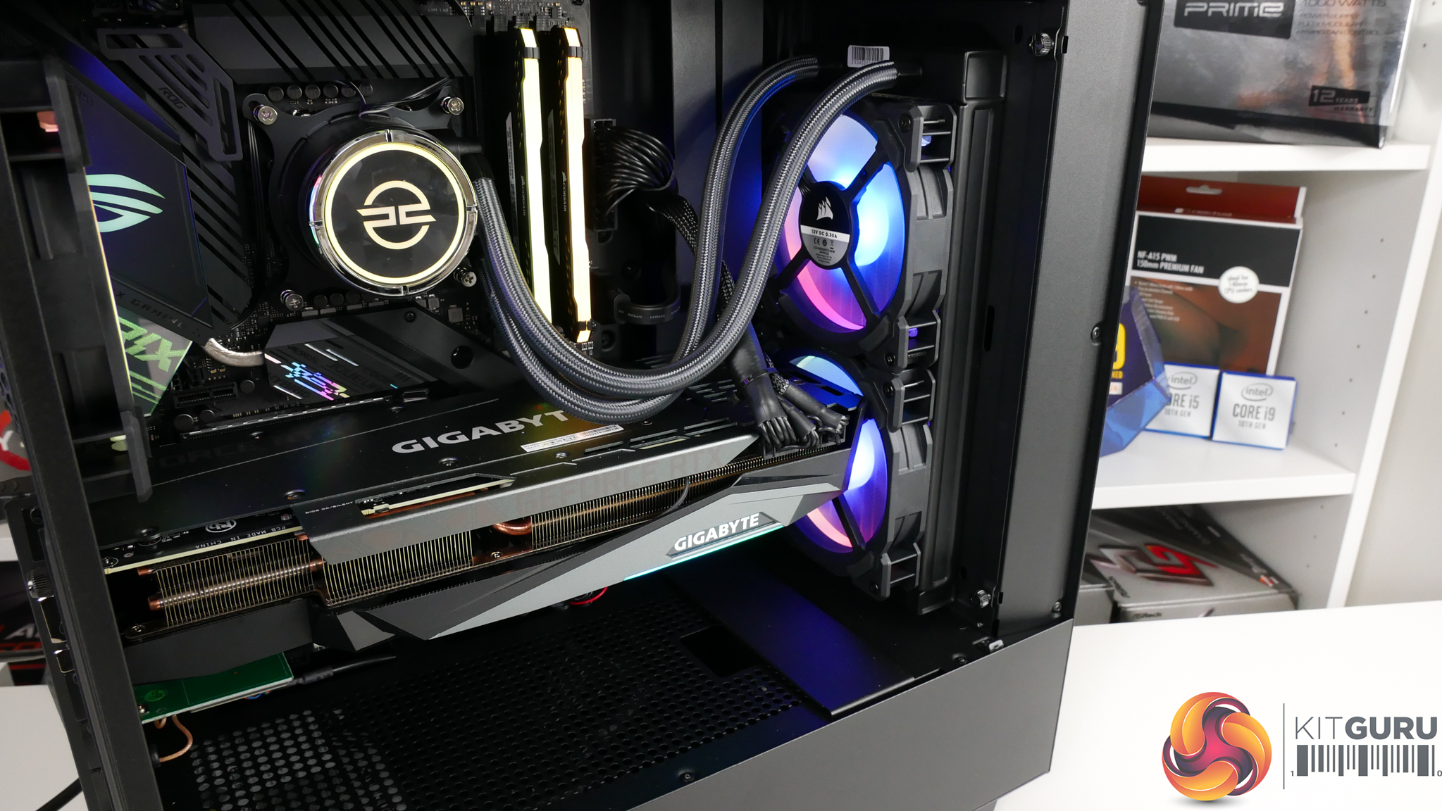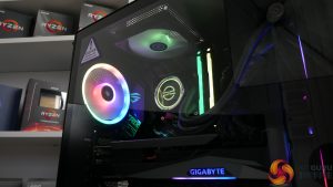 Cooling is handled by a 240mm PCSpecialist FrostFlow 240 series RGB AIO liquid cooler. The dual 120mm intake fans have been switched out to Corsair LL120 RGB models mounted to pull air through the radiator. A 240mm AIO is a perfectly logical partner for the Core i7-10700K, especially when running at its default power modes.