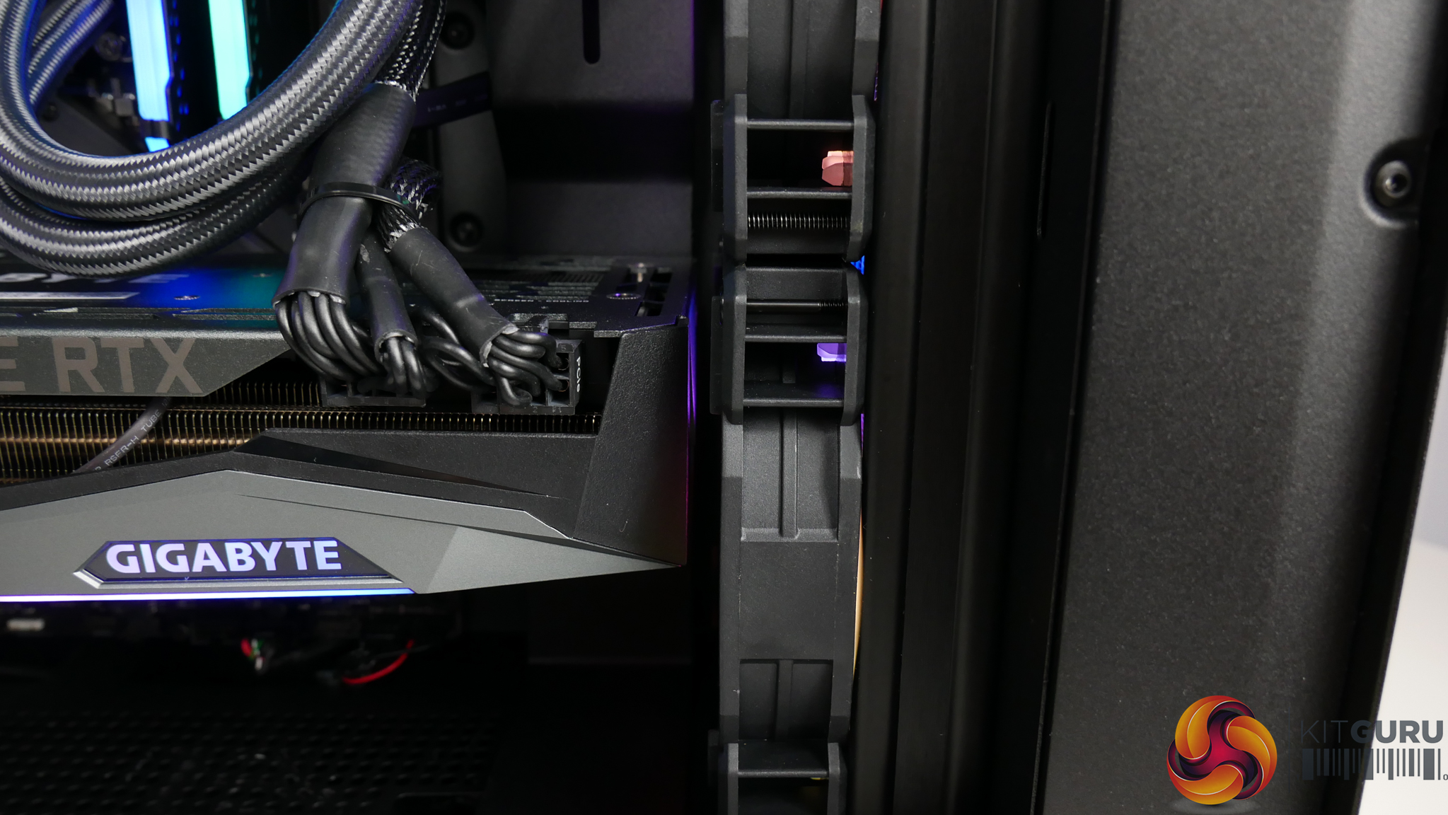 In terms of overall chassis cooling, we have the dual 120mm intakes on the front radiator, we have another Corsair LL120 RGB fan as exhaust in the rear position, and we have one PCSpecialist 120mm RGB fan as roof exhaust. The chassis is basically maxed out in terms of fan installations, other than switching the top exhaust to a 140mm option, so it will be interesting to see the balance of cooling and thermals.