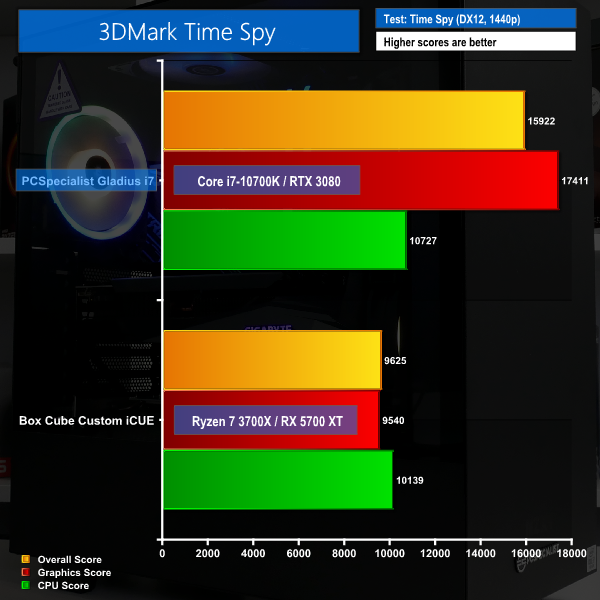 3DMark scoring highlights strong performance from both the CPU and GPU. Neither component looks particularly overpowered compared to the other and this implies strong balance from PCSpecialist’s choice of parts.