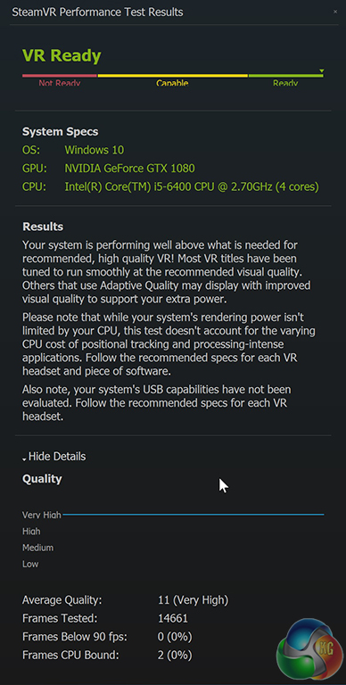 I don't personally have a HTC Vive or an Oculus Rift to benchmark any virtual reality titles. However, going by the SteamVR Performance Tool, the GTX 1080 has more than enough power to drive VR at the highest quality and frame rates.