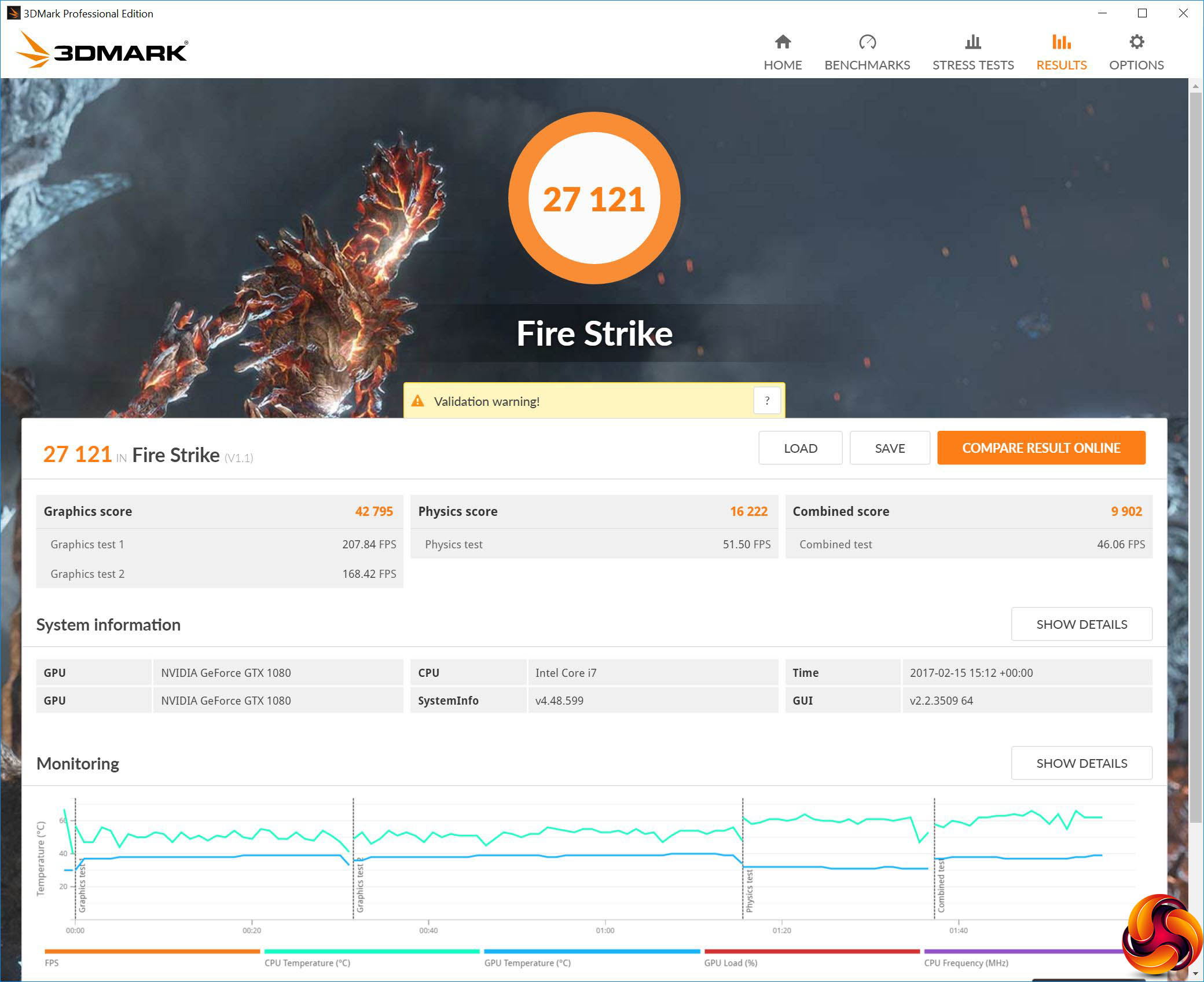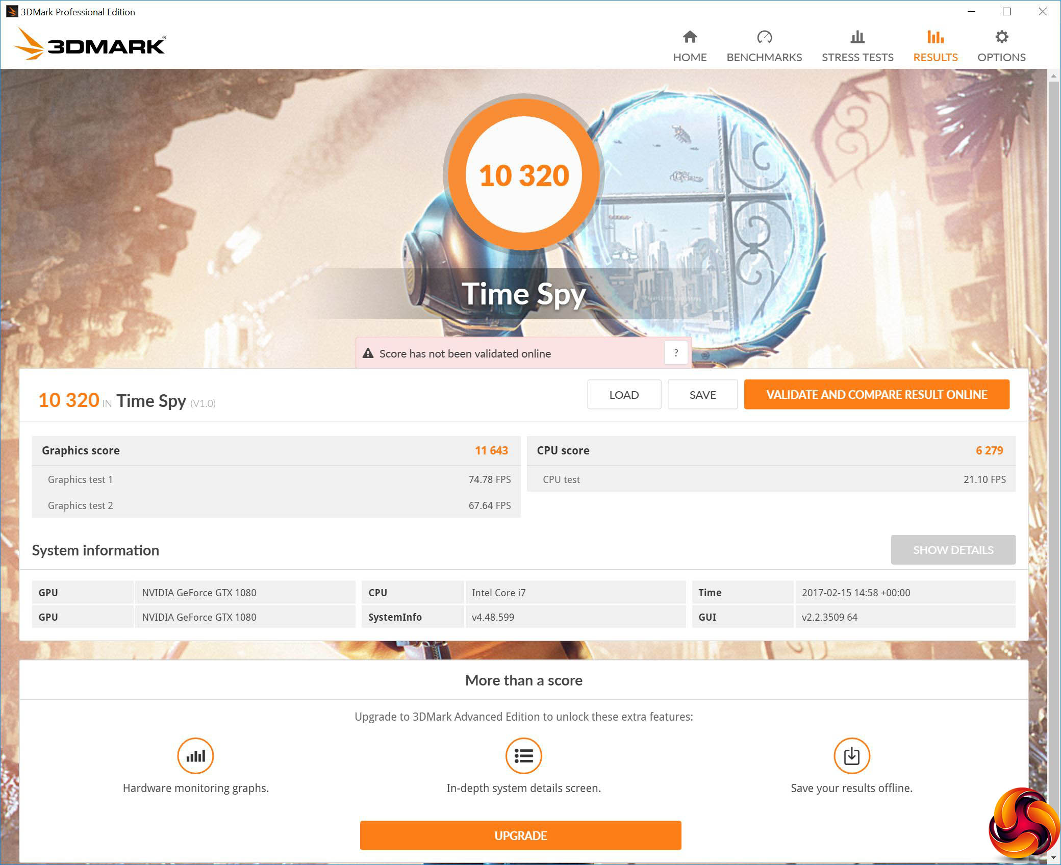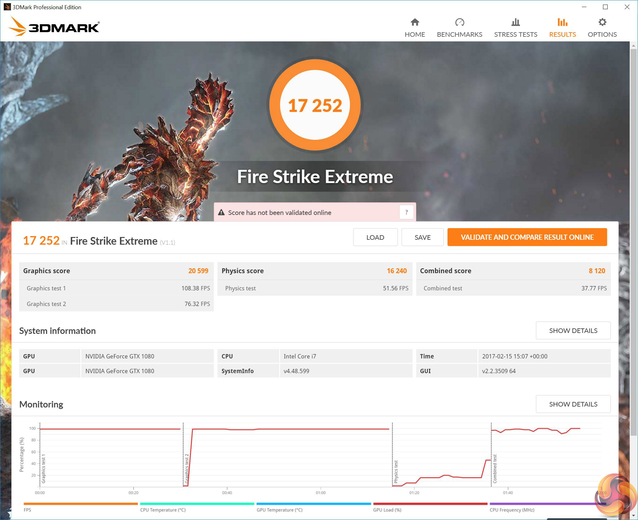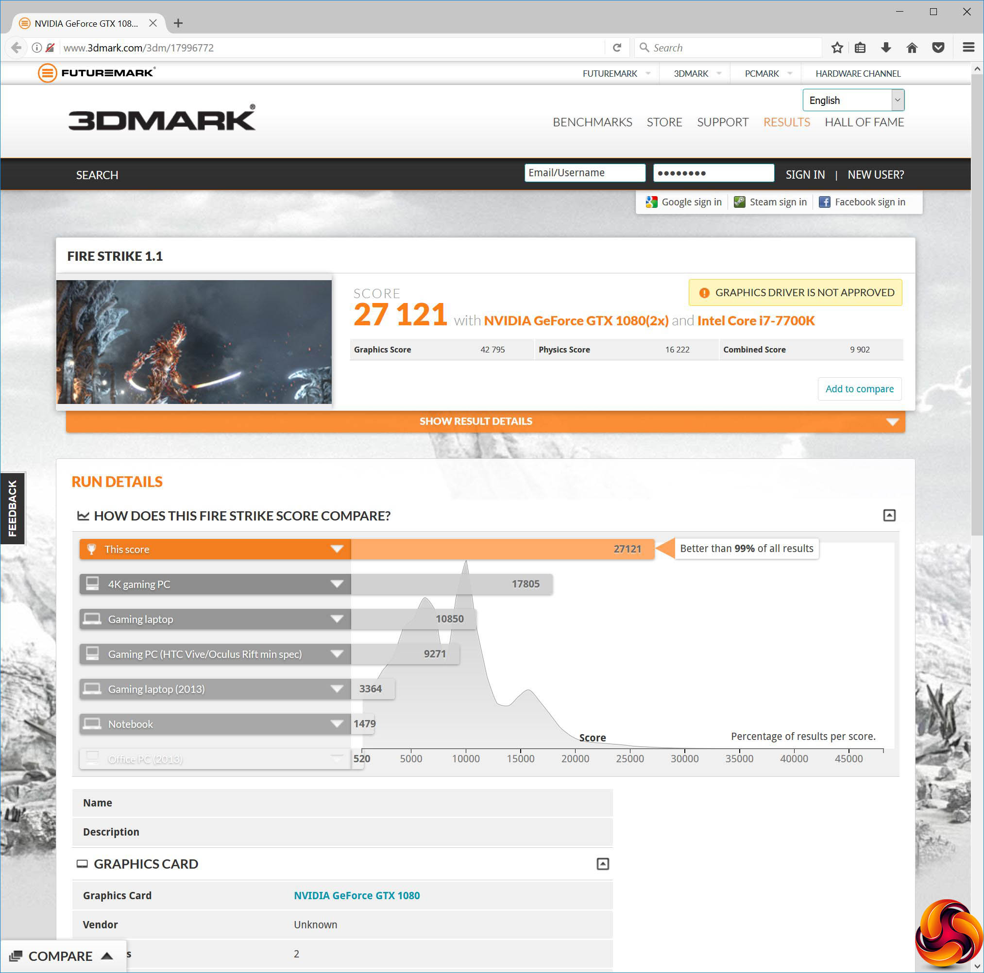 It was a similar story with the graphics driver as the installed version was 376.53 and they didn’t want us to risk version 378.49 as it was an unknown quantity. That’s fair enough but we were truly surprised to see the pair of GTX 1080 graphics cards were linked with flexible SLI bridges – surely the new rigid high bandwidth bridges are de rigeur with GTX 1080? OCUK told us that German Overclocker Der Bauer carried out an analysis of a number of SLI bridges and concluded there was little to gain by using the new HB bridge.