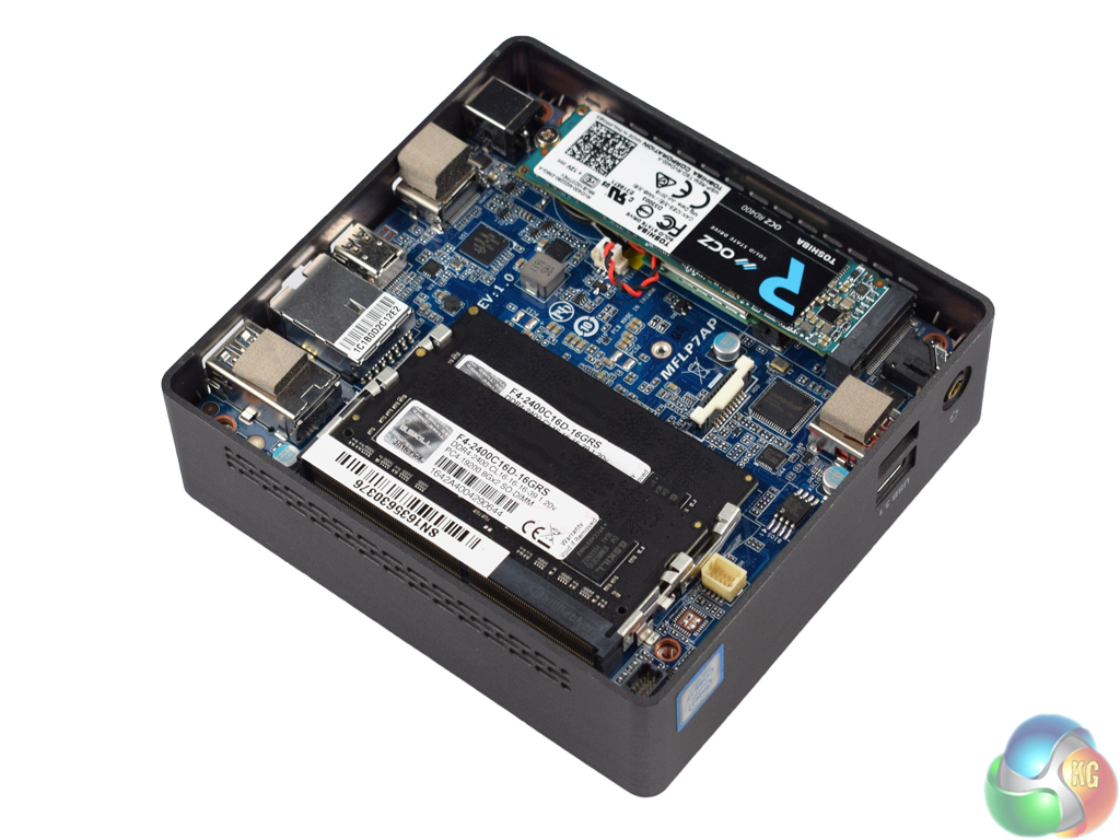 Lastly, we take a look at the innards of the BRIX. Out-of-the-box, 2x DDR4 SODIMM slots are unoccupied, along with 1x M.2 port. There is a second M.2 port which sits underneath the SSD slot, but this is occupied by the WiFi card.