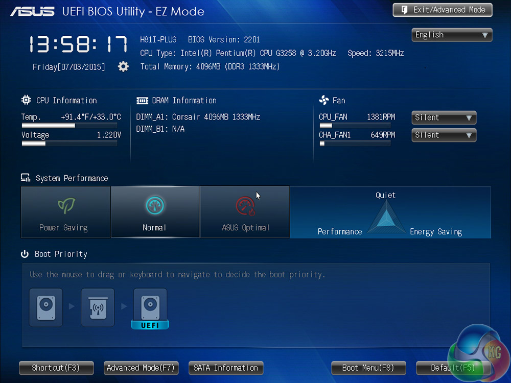 The UEFI BIOS comes with the fan profiles set to silent, to help keep the system running cool. This is likely a smart plan as 80mm fans are not known for their quietness.